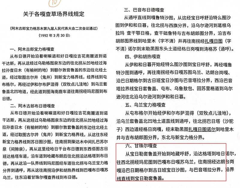 行政确权乱象:两证并行制造嘎查矛盾 侯志平的无罪辩护,始终锚定在一份不容置疑的权属基础上。1992年,阿木古郎宝力格苏木第九届人民代表大会二次会议通过了《关于各嘎查草场界线规定》,清晰划定了甘珠尔嘎查的草场范围;1997年,旗政府为该嘎查颁发草原所有权证,边界坐标与文字描述明确,且与相邻嘎查权属证明无冲突,此后二十余年未发生权属争议。