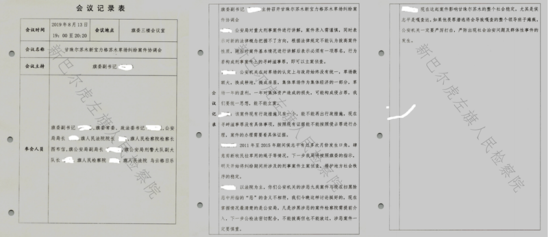 更值得关注的是,2021年,呼伦贝尔市中级法院作出的(2021)内07行初11号行政判决书,曾再次确认了这一权属事实。内蒙古高级法院作出的(2021)内行终584号行政判决书虽然撤销了该11号行政判决书,新巴尔虎左旗政府胜诉,不需要就两个嘎查的草原划界争议重新作出裁决,但是这个584号行政判决书同样没有否定旗政府1997年颁发的甘珠尔嘎查草原所有权证。 “两证都有效,边界却重叠,这本身就是行政行为的漏洞。”法律界人士指出,行政确权的混乱是纠纷的根源,而这份根源性错误,却被后续的刑事追诉所掩盖。 权力干预司法?协调会定调“未查先判”? 如果说“双证并行”是纠纷的导火索,那么2019年8月13日的一场协调会,则直接将侯志平推向了刑事被告席。彼时,草场纠纷尚未进入侦查程序,案件卷宗尚未形成,旗委某领导却主导召开协调会,提前给案件“定性”。