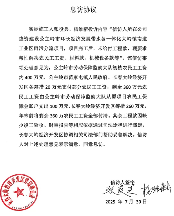 本站讯 近日,吉林省公主岭市一雨污分流工程引发的债务纠纷持续发酵:实际施工方反映,尽管当地政府曾通过会议纪要变更规划、信访部门签订息访协议承诺付款,但至今仍有100万元农民工工资未结清,所涉工程款亦无明确解决路径。这一事件不仅暴露了工程程序的违规操作,更引发了公众对政府公信力的严重质疑。 环保“特事特办”埋隐患,工程程序违规引争议 根据相关文件,此次事件的源头可追溯至2020年11月,当时公主岭市为应对环保检查的“特事特办”,为快速推进雨污分流改造工作,当地政府以会议纪要形式作出专项决策:将该雨污分流工程不再履行单独招标程序,而是并入已完成招标的环长水务一体化工程项目中,同时取消原招标项目中的污水处理水厂建设内容,直接变更为雨污分流施工。