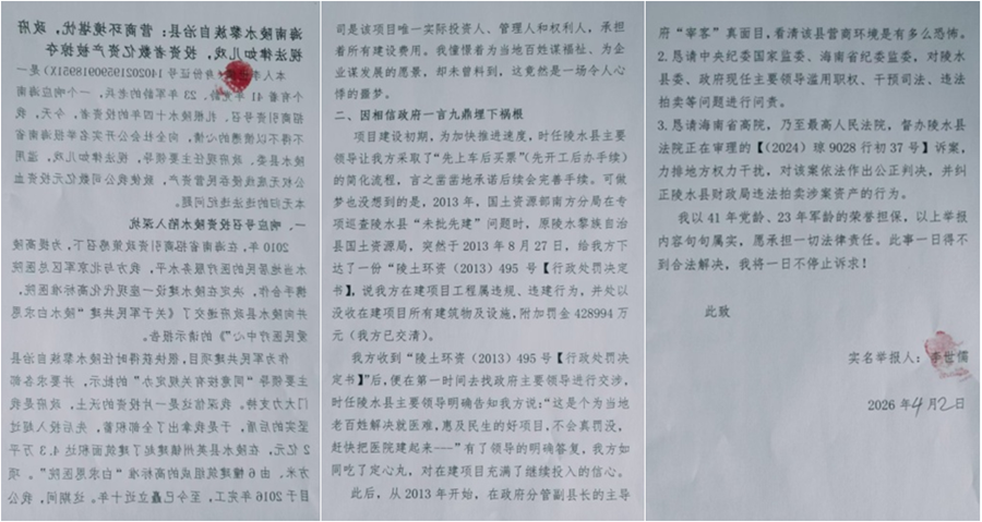 如今,我的案件仍挂在陵水法院,而法院却因来自政府的压力进退维谷“断而不决”,我实在是油尽灯枯耗不起,只能寄望于网络舆论,寄望于上级组织。 本人恳请: 1.恳请广大网民透过现象看本质,彻底看清陵水县政府“宰客”真面目,看清该县营商环境是有多么恐怖。 2.恳请中央纪委国家监委、海南省纪委监委,对陵水县委、政府现任主要领导滥用职权、干预司法、违法拍卖等问题进行问责。 3.恳请海南省高院,乃至最高人民法院,督办陵水县法院正在审理的【(2024)琼9028行初37号】诉案,力排地方权力干扰,对该案依法作出公正判决,并纠正陵水县财政局违法拍卖涉案资产的行为。 我以41年党龄、23年军龄的荣誉担保,以上举报内容句句属实,愿承担一切法律责任。此事一日得不到合法解决,我将一日不停止诉求! 此致 实名举报人:李世儒 2026年4月2日 |