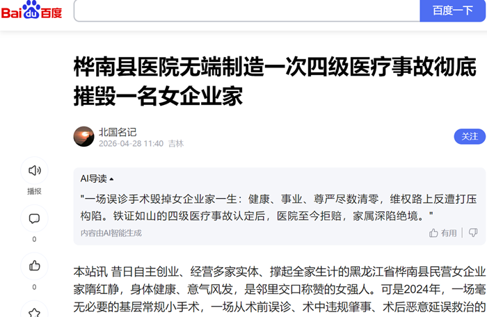 隋红静在万般无奈、求助无门的情况下,被迫远赴北京依法正常走访信访,如实递交医疗事故鉴定铁证、家庭困难材料、医院拒赔实情,只求公平公正、依法维权。令她万万没有想到的是,正常进京信访维权之举,彻底触怒了当地相关人员,随即给她扣上非法开采的罪名,并将相关卷宗移送当地检察院,后续又对其办理了取保候审强制措施。 时至今日,无端罪名尚未厘清,取保候审仍未解除。长期高压打压之下,隋红静心理恐惧愈发严重,日夜心神不宁、寝食难安,夜夜噩梦缠身,频频梦见公安上门传唤追责,精神濒临崩溃边缘,本就重度受损的身心健康雪上加霜,维权信心彻底受挫,合法维权之路彻底陷入绝境。 记者实地核实,院长避而不答,科室负责人默认属实 2026年4月27日,媒体记者专程赶赴黑龙江桦南县实地深度调查,陪同受害者隋红静前往桦南县医院院长办公室,试图当面核实医疗事故善后、赔偿搁置、维权受阻等全部实情。 记者主动出示正规采访介绍信,明确表明核实情况的来意,当面直接询问该院院长周德贵:隋红静是否在本院术中遭遇缝针遗留腹腔四级医疗事故、法定全责已定前提下,医院为何长期拒不落实赔偿善后、为何院方拒不回应患者合理诉求? 面对铁证事实、记者当面问询,院长周德贵却全程摆足了官架子、刻意回避核心问题,一味推脱声称院内外来记者采访必须提前专项报备,拒不正面回应事故实情、拒不解答赔偿拖延疑问。话音未落,他便以公务为由仓促起身下楼躲避。记者与当事人紧随其后全程追问,周德贵始终闭口不答。 随后,当事人拨通了该院医务科长、医调委主任张慧楠的电话,张主任证实了隋红静所反映的全链条医疗事故、术后违规处置、医院拖延拒赔等全部情况,院内全程知情、事实无误,鉴定报告真实,侧面坐实了院方全责却恶意拖延善后、漠视患者权益乃至生命的全部实情。 受害者只求公道,期盼依法追责兑付赔偿 一场不该发生的误诊手术,一次全链条漠视生命的医疗失职,摧毁一位实干民营女企业家的一生,拖垮一个无辜的家庭。基层医疗安全底线失守,履职监管形同虚设,事故定论后追责赔付迟迟落空,其合法信访维权反遭打压构陷,取保候审缠身,身心双重重创,求助无路、维权无门。 截至目前,隋红静及家属唯一的诉求,就是恳请上级卫健主管部门、纪检监察部门依法从严从快倒查追责涉事医护履职失职行为,从严查处医院漠视医疗规范、拒不履行赔偿责任违规行为;撤销给当事人定上的罪名、解除取保候审强制措施,严查公职人员口头安抚、背后打压、阻挠合法维权的失职失责行为;依法依规足额兑付全部医疗事故伤残赔偿金、后续终身康养治疗费、家庭生活困难补助,还受害者一个迟来的公道,还破碎家庭一份生活希望。 业内人士直言,基层医疗机构每一台手术都关乎人命,容不得半点疏忽大意,更容不得违规误诊、术中肇事、术后推诿;法定医疗事故鉴定全责定论不是终点,追责到人、足额赔付、暖心善后,才是守护医疗公平、守住医者初心、维护群众合法权益的应有之义。针对本案后续进展,媒体将持续跟踪关注、全程客观纪实报道。(记者李瑞 峻岭)