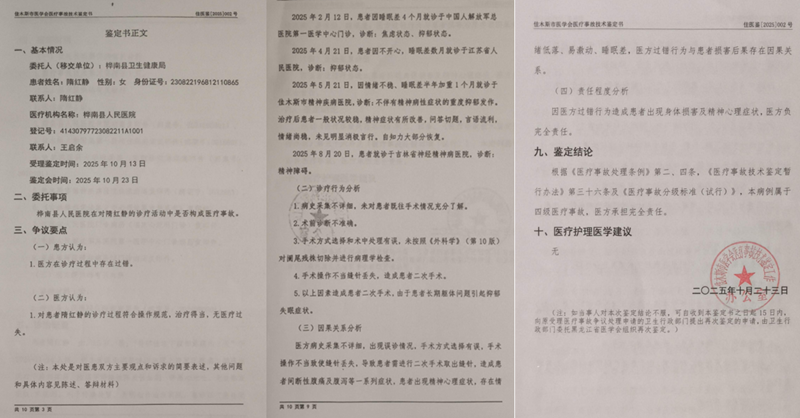 误诊在先,恶性误治紧随其后,术中多重违规操作接连叠加,直接重创患者躯体。手术全程偏离正规诊疗流程,术中核查发现患者仅存在阑尾残端轻微炎性反应,本应依规规范清创、对症抗炎保守处置即可痊愈,医护人员却违规采用病灶盲目包埋兜底处理方式,刻意隐匿封闭腹腔内部炎性病灶,治标不治本、违规施治,直接导致术后腹腔炎症持续反复、顽固性腹痛久治不愈,永久性损伤肠胃基础消化功能,埋下终身器质性病变隐患。 更触目惊心的是,术中突发重大手术安全责任事故,医护实操严重失误,医用手术缝针意外弹飞脱落,直接遗落留存在隋红静腹腔深处。事故突发后,院方未第一时间启动应急急救预案、紧急联动上级医院转诊施救,反而在封闭手术室内耗时三小时反复盲目探查翻找异物,期间不顾患者身体耐受极限,违规三次叠加注射麻醉药剂,多重麻醉重创脏腑机能,反复腹腔翻动拉扯加剧体内软组织不可逆损伤。三小时徒劳探查无果、确认无法安全取出遗留缝针后,医护草草缝合切口结束手术,主刀医生仅轻描淡写的告知家属术中异物遗留实情,态度冷漠、毫无愧疚歉意,漠视患者生命健康与家庭担忧。 术后违规转运延误救治,身心同步彻底崩溃 事故已成既定事实,后续处置依旧乱象丛生,层层违规持续透支患者的生机。在家属反复强烈交涉、多方施压诉求下,院方才被动同意将重度受伤的隋红静紧急转诊至佳木斯大学附属第一医院,接受二次开腹急救手术、全麻取出腹腔遗留缝针。转诊救治过程中,更是出现违背医疗行业常规的反常乱象:上级三甲医院设备精良、医师资质过硬、急救诊疗能力远超基层县级医院,完全可独立合规完成二次急救手术,无需基层医护跨院协助,但桦南县医院涉事主刀医生,违规强行进入上级医院无菌手术室参与全程手术,此举引发家属强烈质疑,直指院方刻意跨院插手施救流程,只为私下掩盖术中违规操作漏洞、规避岗位履职失职责任、洗白诊疗过错,疑点重重、难以辩驳。 二次术后康复黄金窗口期内,院方再次违规加码,罔顾患者腹腔创口未愈、炎症未消、并发症尚未全面排查、亟需专业闭环康养救治的客观实情,仅术后四天,就由医院相关书记直接调度120急救专车,强行将隋红静转出正规三甲诊疗病区,违规送入该院下属非医疗资质养老机构,强行开展非专业所谓后续养护,彻底错失了术后抗炎、创面修复、并发症干预最佳诊疗时机。 违规养老机构低效无效养护半月时间里,隋红静病情急速恶性恶化,肠胃消化功能近乎彻底崩溃,出现持续性重度腹泻、进食即刻排泄,无法正常饮食补给营养,腹部隐痛全天候伴随、腹腔异响频繁发作,躯体痛苦日夜煎熬、难以入眠。家属心急如焚,多次强烈申请转院正规救治,几经周旋奔走后,才得以转入哈尔滨医科大学附属第二医院短期对症施救七天。自此,隋红静被迫开启跨地域、长时间、高成本的漫漫求医路,先后往返北京两地、南京两地,辗转沈阳、吉林多地各大权威三甲医院,全年奔波求医、身心俱疲。 遗憾的是,器质性损伤已成终身定局,叠加长期病痛折磨、反复手术创伤阴影、异地求医奔波劳累、维权初期屡屡碰壁的满心委屈,多重压力层层叠加压垮了隋红静心理防线。全国多家权威医疗机构同步确诊:重度抑郁发作、重度焦虑障碍、顽固性睡眠障碍、伴随躯体应激性精神并发症,多重身心重疾缠身。曾经乐观开朗、独立自强的女强人,彻底被病痛与绝望裹挟,昼夜神志恍惚、精神萎靡,整夜顽固性失眠头痛,常年深陷痛苦、委屈、绝望闭环,直言余生每日皆是煎熬,人生彻底失去光亮。 维权有理有据,医院拒赔态度强硬 这场全链条恶性医疗事故,直接摧毁一个实干企业家,拖垮一整个普通家庭。事故发生前,隋红静独立经营实业、收入稳定可观,独自承担两名未成年在校子女监护照料全部责任,把家庭生活打理得井井有条,是全家核心经济支柱、精神依靠。 事故致残之后,一切尽数归零。永久性肠胃器质性损伤、终身消化功能受限,日常饮食严苛受限,无法劳作、无法正常出行;重度精神障碍、应激创伤后遗症突发频发,患上重度开车恐惧症,无法独立驾车出行,简单佩戴安全带都会诱发剧烈腹痛应激反应,彻底丧失全部劳动能力、独立生活自理能力。如今日常起居、饮食用药、身心陪护,全部需要家人24小时专人贴身照料看护,再无精力顾及未成年子女学业陪伴、生活照料,两个孩子不仅失去了母亲的悉心呵护,还要跟着全家承受负债求医、日夜忧心母亲病情的重压。 为求医、做鉴定、跑维权,家中积蓄快速消耗殆尽,家庭收入彻底断档,生活开支、医药费、陪护费、交通费层层叠加负债,原本安稳富足的小康之家,一夜跌入贫困绝境,全家生活举步维艰,苦不堪言。 维权路上,法理证据完备,维权之路却寸步难行。据隋红静提供的大量证据,纠纷发生初期,桦南县医院全程矢口否认诊疗过错,拒不承认误诊、误治、术中遗落器械、术后违规转运全部违规事实,百般推诿扯皮、拒不沟通善后、拒绝合理赔付。直至属地桦南县卫生健康局依法介入,委托佳木斯市医学会启动专业医疗事故合规司法鉴定,出具了正式的佳医鉴[2025]002号权威医疗事故鉴定文书。