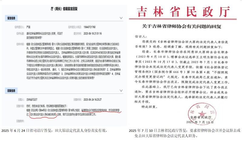 2. “假会长”疑云之二:离任审计造假当选会长,主管领导林松涉操纵选举,程序违法。 根据《社会团体登记管理条例》及相关财务管理规定,社会组织法定代表人离任时,需进行离任审计,厘清经济责任后,方可进行变更。然而,根据吉林省吉储橡胶厂职工提供的材料及相关部门的部分答复,田大原在担任长春市律师协会会长期间,其离任审计程序存在疑点。 早在2023年4月,田大原在未卸任长春市律师协会会长、亦未完成合规离任审计的情况下,便被吉林省司法厅主管律师协会的副厅长林松推荐为省律师协会会长候选人,并“顺利”当选。林松在田大原未能提供由民政局委托的会计师事务所出具的离任审计报告的情况下,依然批准通过了其法定代表人身份的变更审核。这一明显的违规状态竟然持续了长达两年多的时间,直至2025年7月10日,吉林省民政厅在答复中明确指出其兼任违法并下达《责令改正通知书》。这被举报者形容为“未下旧鞍,便跨新马”,程序上的先后顺序与严谨性存在明显瑕疵,且监管环节在最初便已失守。 3. “假会长”疑云之三:吉林省民政厅确认田大原法定代表人身份无效,司法厅公然说“程序合法,省律师协会法定代表人田大原合法有效”。 2025年6月18日,吉储橡胶厂职工曾经在吉林省司法厅厅长信箱咨询:“请问吉林省律师协会法定代表人变更,司法厅是否做得尽职审查?”。根据《社会团体登记管理条例》第十八条社会团体的登记事项需要变更的,应当自业务主管单位审查同意之日起30日内,向登记管理机关申请变更登记。 根据《社会团体登记管理条例》第十二条第三款规定:社会团体的法定代表人,不得同时担任其他社会团体的法定代表人。 吉林省律师协会法定代表人田大原,在2023年4月8日当选吉林省律师协会会长前为长春市律师协会法定代表人。根据信息,长春市律师协会的法定代表人现在仍然为田大原,据长春市律师协会的上级主管机关长春市司法局律师工作处工作人员介绍:之所以没有变更,是因为长春市律师协会是自己私下找的会计师事务所进行法定代表人离任审计,没有按照长春市民政局的要求使用指定招标的会计师事务所进行审计,导致法定代表人一直没有变更。 请问, 1、现在吉林省律师协会田大原的法定代表人身份是否有效? 2、吉林省律师协会法定代表人变更程序是否合乎法律规定? 3、吉林省律师协会变更法定代表人时候提交的材料是否虚假? 4、吉林省司法厅作为业务主管机关在吉林省律师协会法定代表人变更问题上是否做到尽职审查? 2025年6月24日司法厅答复:根据《中华人民共和国民法典》第六十四条及《社会团体登记管理条例》第十八条之规定,省律师协会已按照法定程序选举、并完成变更登记,田大原法定代表人身份真实有效。目前,我厅正在指导长春市司法局完成变更工作。 2025年7月10日,吉林省民政厅给省律师协会下达的《责令整改通知书》要求的是:要求吉林省律师协会组织召开理事会议,辞去或免去田大原省律师协会法定代表人,选举新的法定代表人并履行相关手续。